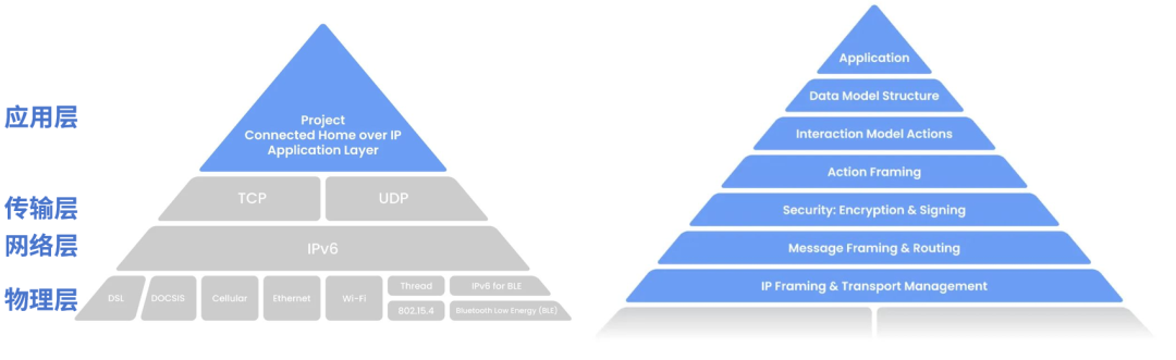 Matter协议基于IP架构,仅定义应用层标准,主要依赖支持IPv6的网络层和传输层进行数据传输。在此IP架构下,Matter网络无需额外网关或专有协议即可完美兼容Wi-Fi(高带宽)、Thread(低功耗网状网络)与以太网等IP协议,实现设备间的本地化互联。此外,Matter网络还可通过Matter Bridge桥接Zigbee、Z-Wave与蓝牙等非IP协议。