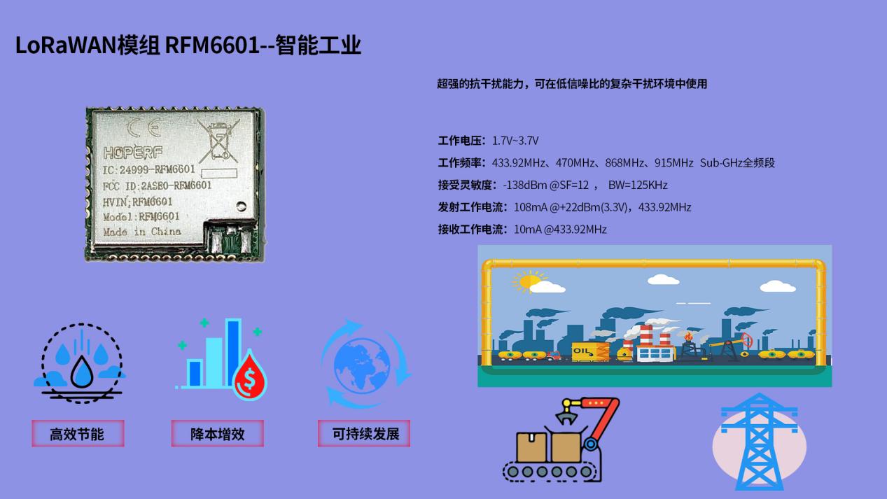 例如,RFM6601就是一款350VIP浦京微自主研发的,通过FCC/CE/IC认证的,具备低功耗、高灵敏度、远距离通信与高性价比等优势的LoRaWAN®模块,其采用先进的数模混合设计,基于独创自适应速率算法,能高效构建LPWAN网络,支持LoRaWAN®节点,大幅延长终端设备(尤其是传感器)的使用寿命。
