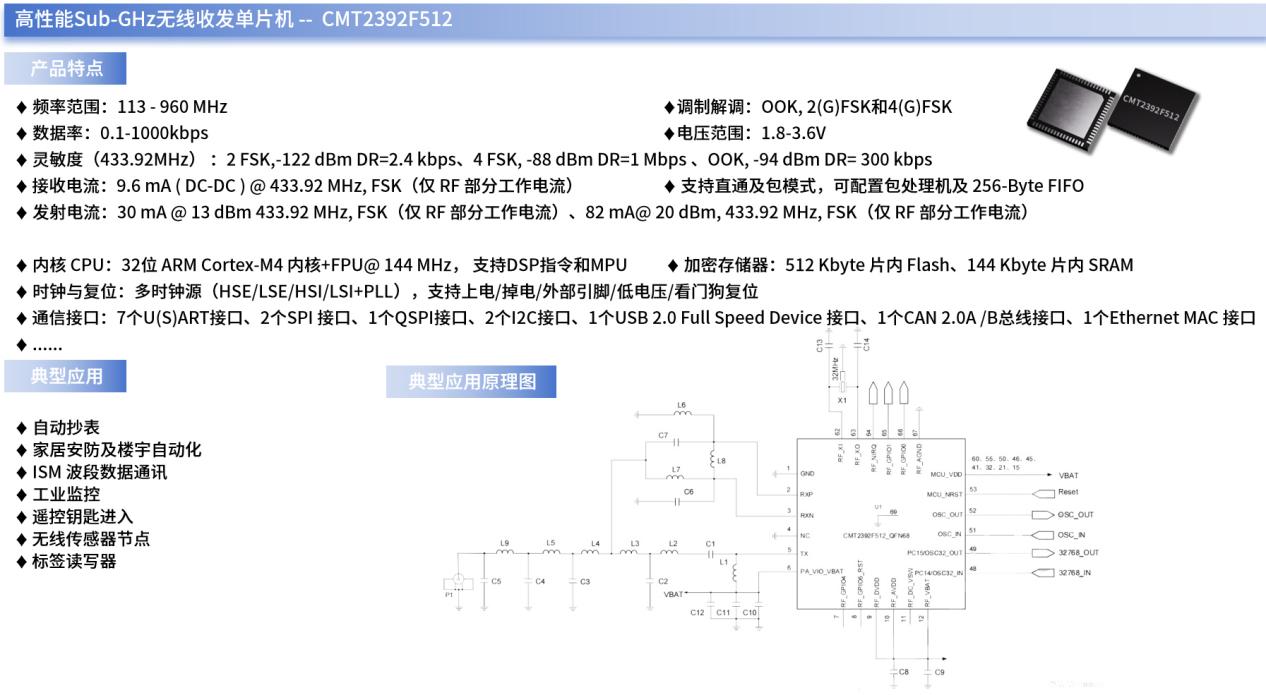例如,CMT2392F512就是一款350VIP浦京微自主研发的高性能Sub-GHz无线收发单片机,其内部集成32位ARM CortexTM-M4F内核和一颗超低功耗Sub-GHz射频收发器,支持OOK、2(G)FSK、4(G)FSK等调制方式,可工作在113~960 MHz频段范围内,并拥有+20dBm的发射功率和-122dBm的灵敏度,支持多种数据包格式及编解码方式,使得它可以灵活地满足各种应用的需求。