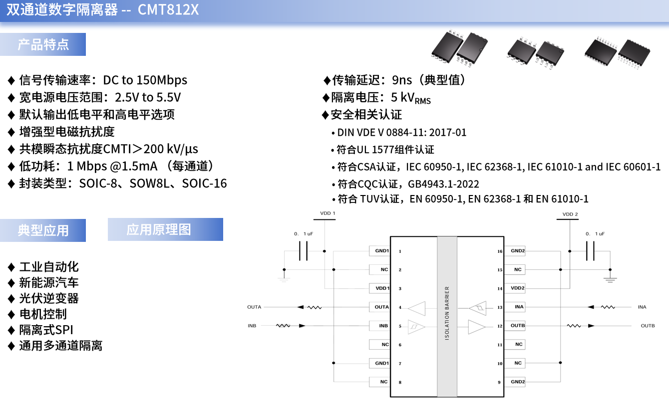 例如,CMT812X就是一系列350VIP浦京微自主研发的、可用于USART串口通信中的高速双通道数字隔离器。它采用二氧化硅(SiO2) 绝缘栅,支持高达5 kVrms隔离电压,应用在两个不同电源域间通讯时,还能防止数据总线或其他电路上的噪声电流进入本地接地或者干扰及损坏敏感电路。