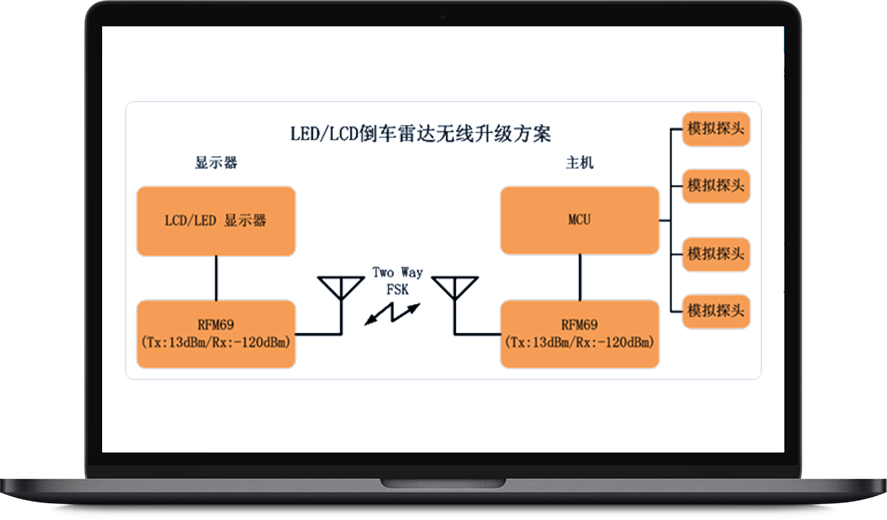 传统LED/LCD显示器倒车雷达产品由显示器和探头检测主机两部分组成,其中探头检测主机负责多路超声波探头测距,然后通过算法把距离等数据通过数据线传送至显示器。由于传输方式通过有线,显示器需要安装在驾驶仪表盘位置,而探头主机需要接近探头,所以线材必须从车尾引至车头,存在布线麻烦。如果采用无线射频通讯方式,可以很好解决此麻烦。在显示器和主机各增加一个双向的RF模块,彼此之间通过双向无线传输,可以保证数据有效和准确性,同时也免除装车埋线之麻烦。